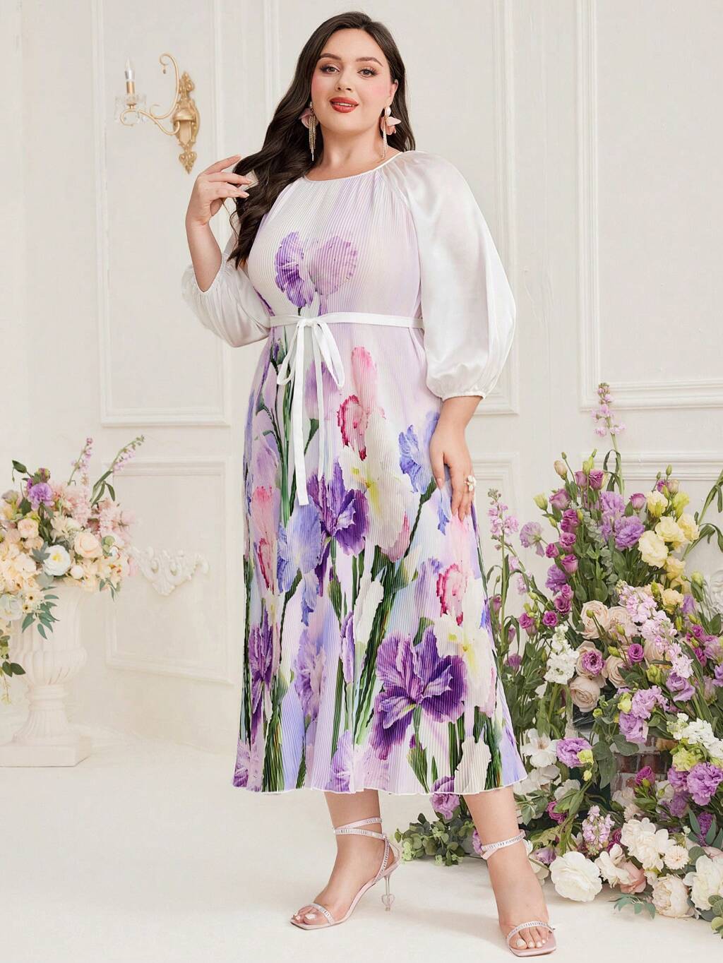 Plus Size Floral Printed Lantern Sleeve Belted Dress Long Evening Dresses