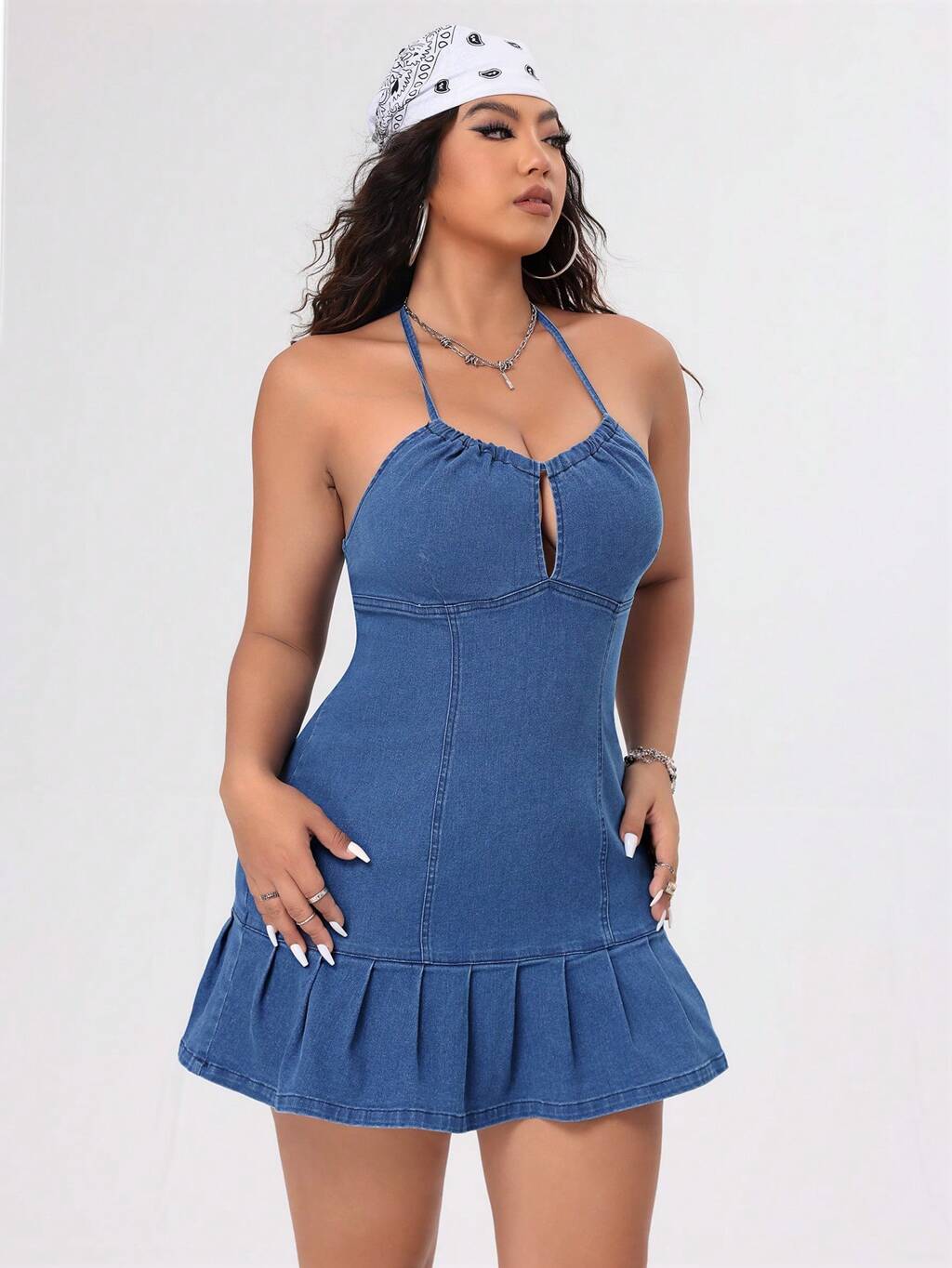 Plus Size Women's Denim Dress With Ruffled Hem, Halter Neck And Belted Waist