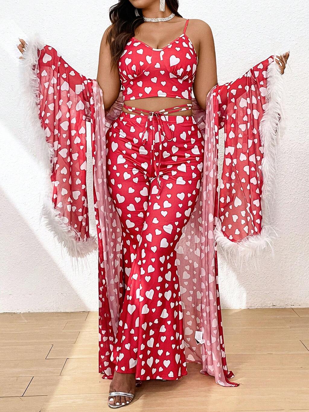 Plus Size Women's Fluffy Sleeve Cuff Bell Sleeve Jacket With Short Tank Top And Flare Pants Heart Printed 3pcs Outfits