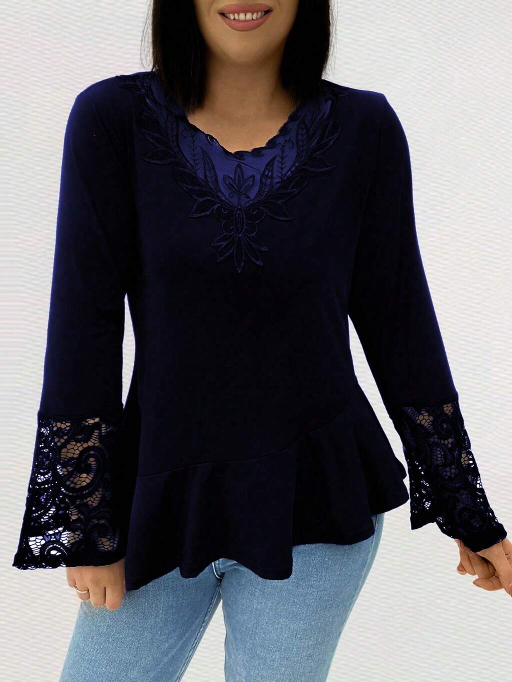 Plus Size Lace Patchwork Bell Sleeve Asymmetrical Hem T-Shirt