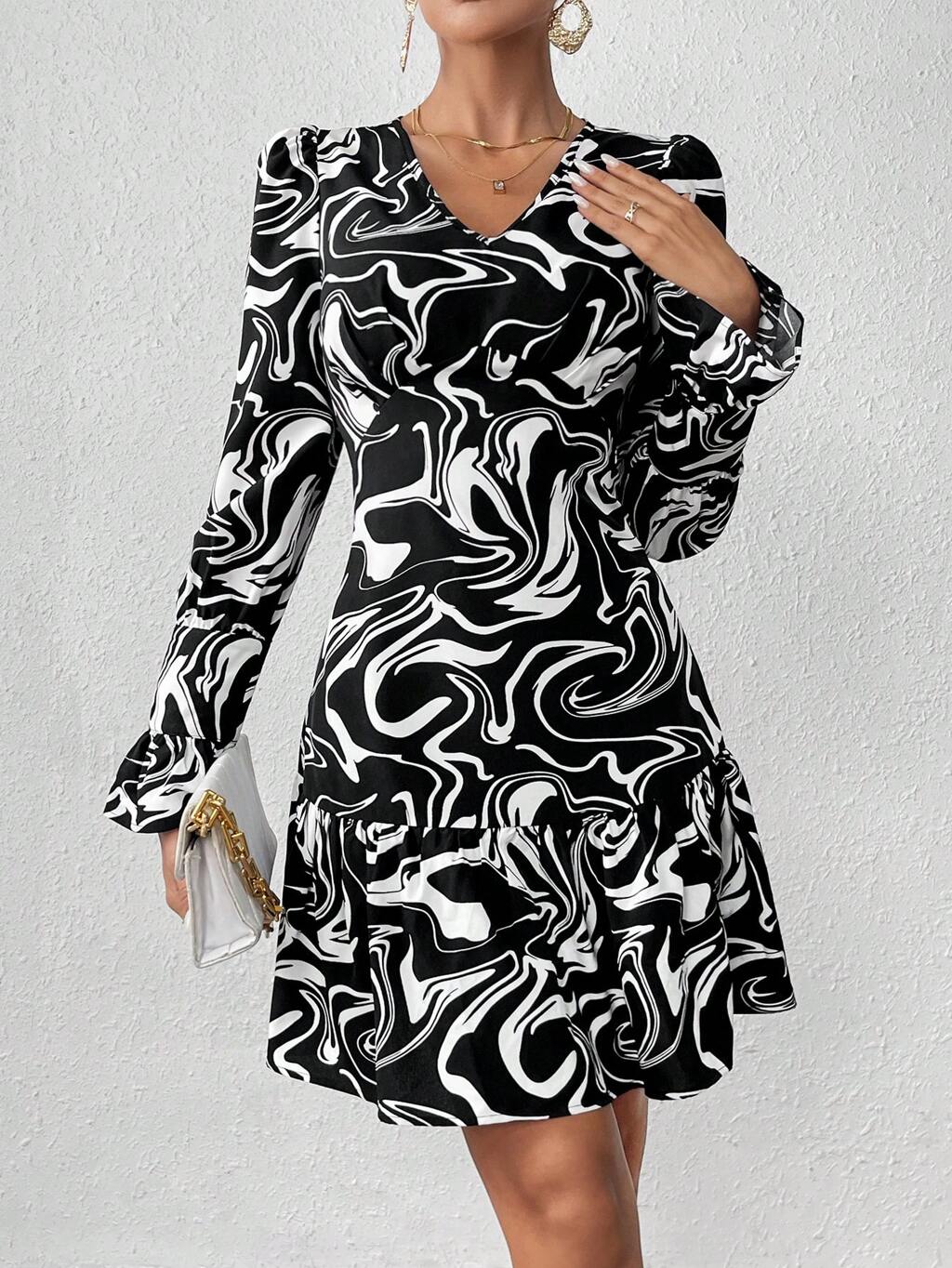 Women'S Patchwork Ruffle Hem Long Sleeve Dress