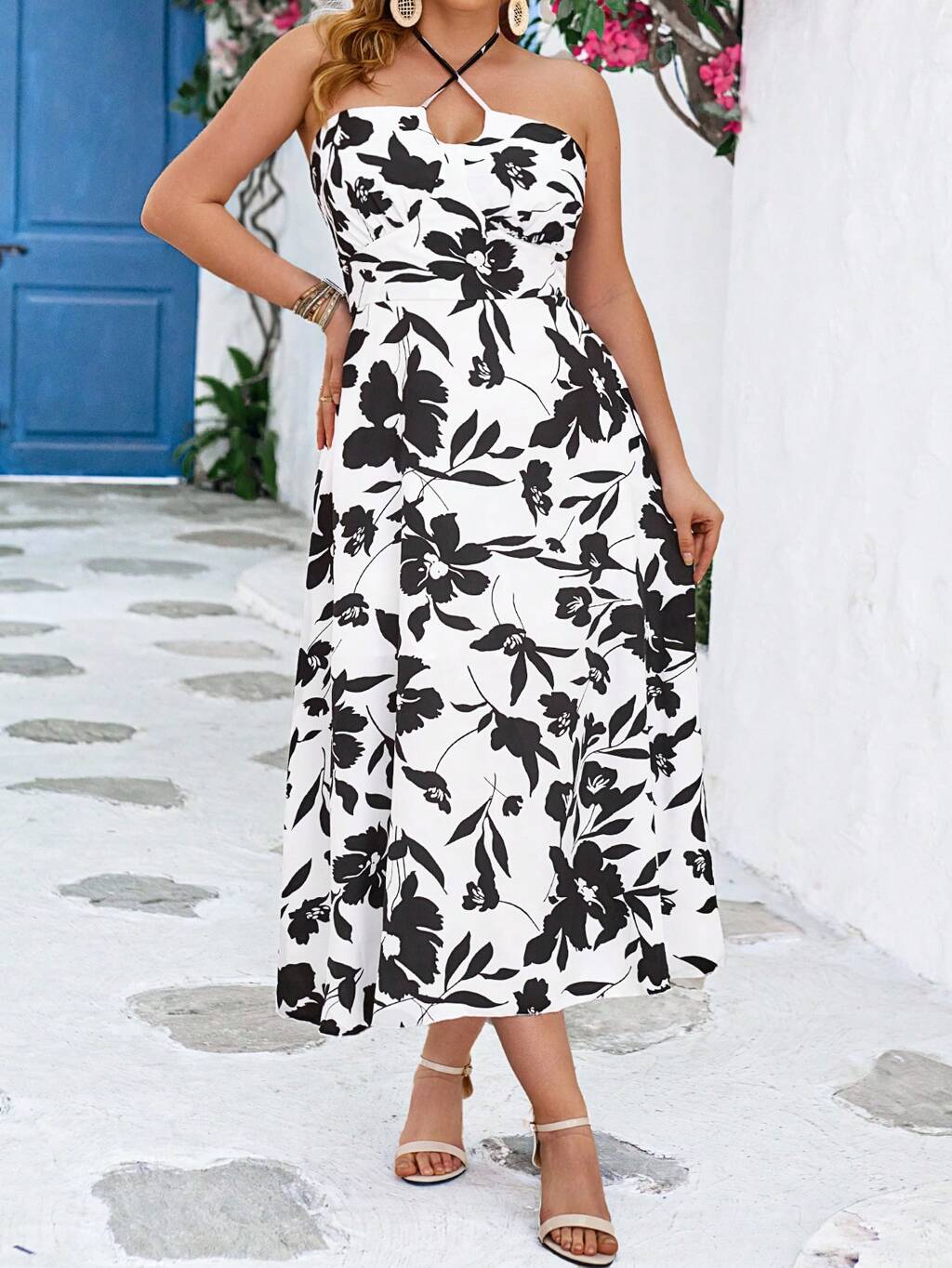 Plus Size Asymmetrical Neck Hollow Out Waist Tie Floral Print Dress, Summer
