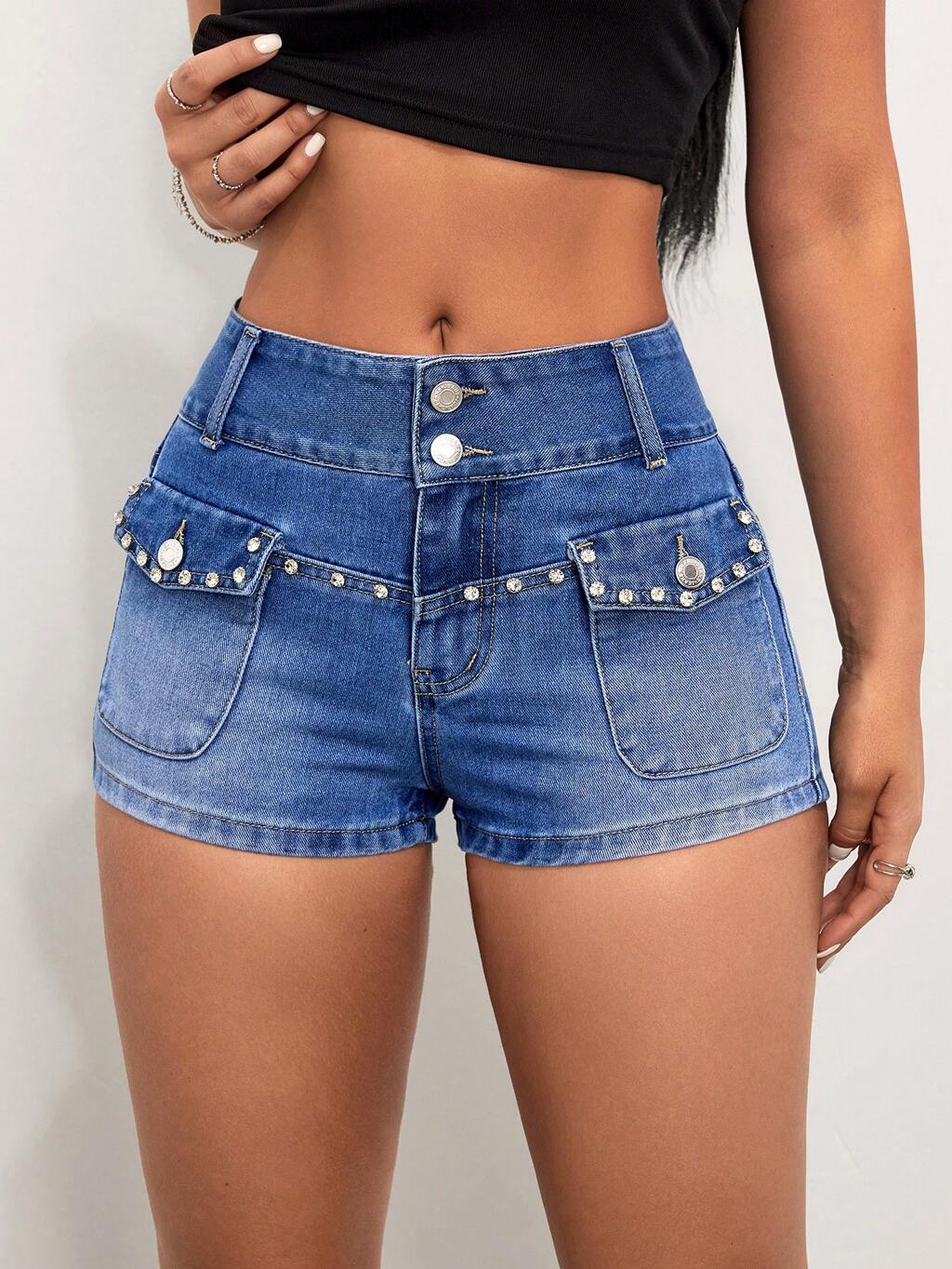 Rhinestone Embellished Denim Shorts With Washed Finish