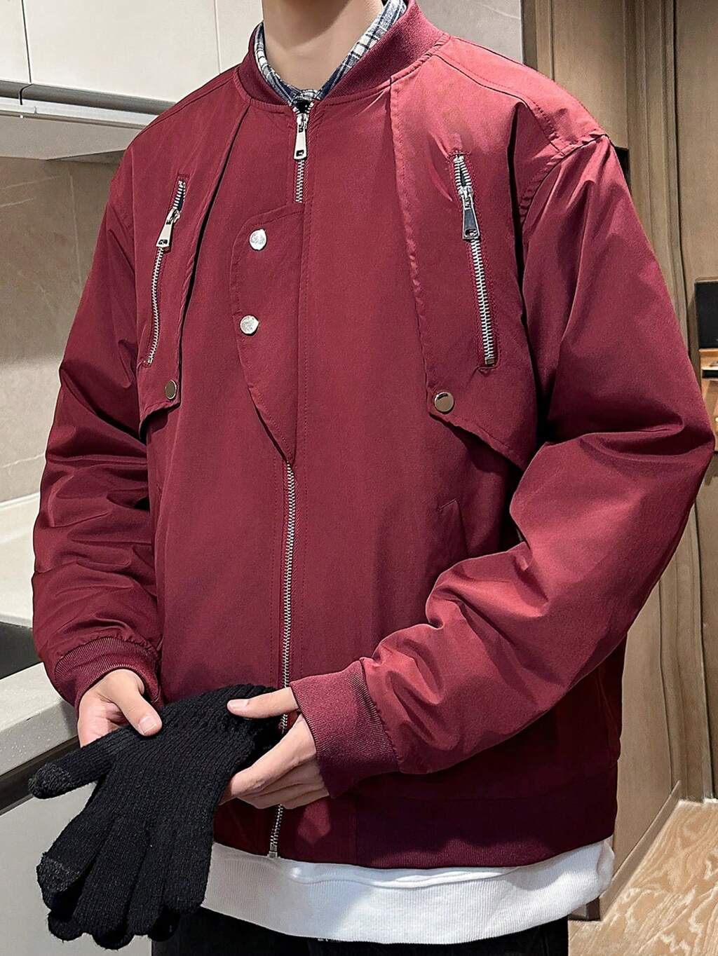 Loose-Fitting Men's Zipper-Up Drop Shoulder Bomber Jacket (Excludes T-Shirt)