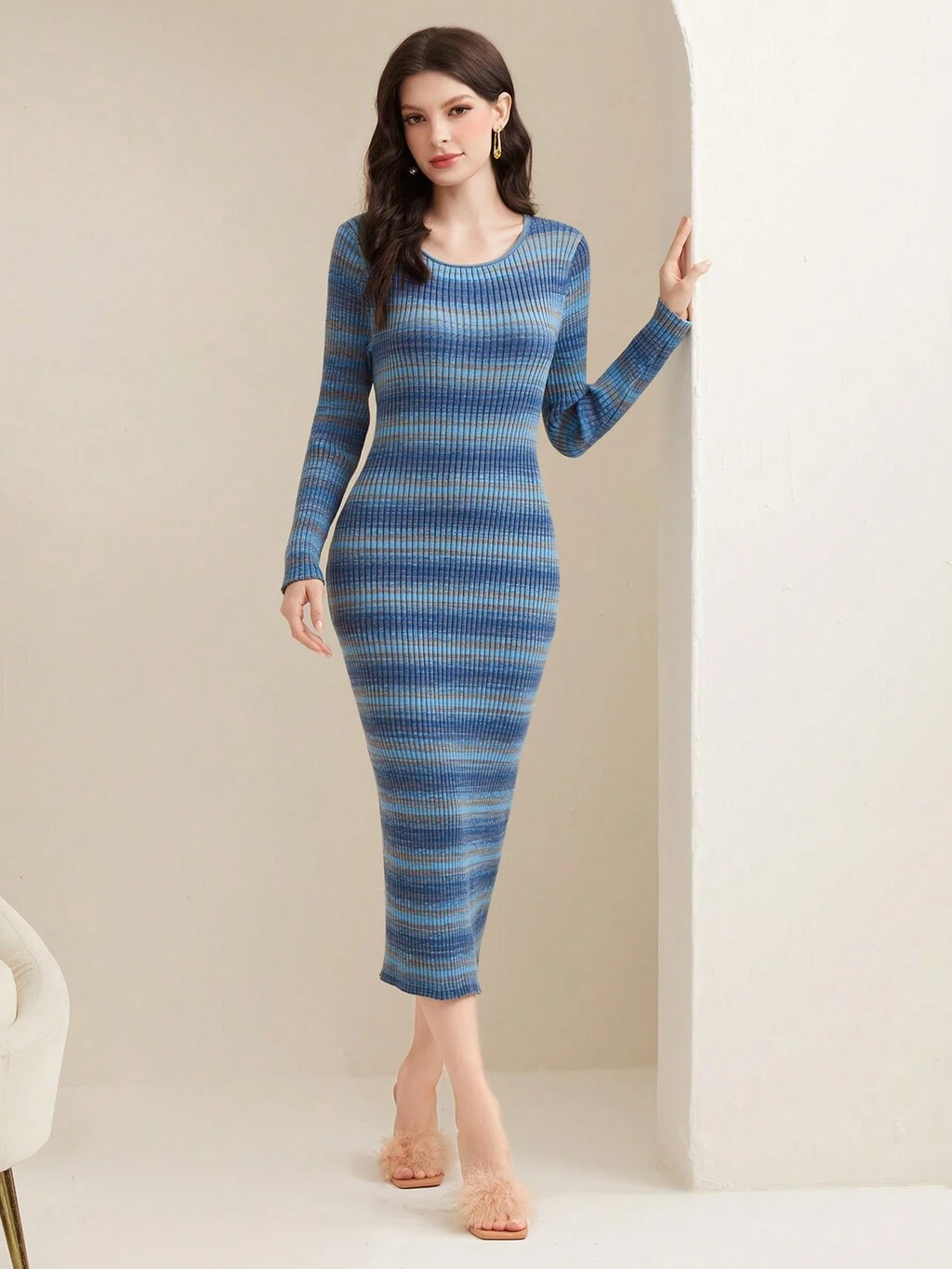 Mixed Yarn Sweater Dress, Random Color Distribution Of Yarn, Belt Not Included Fall Cloth For Women