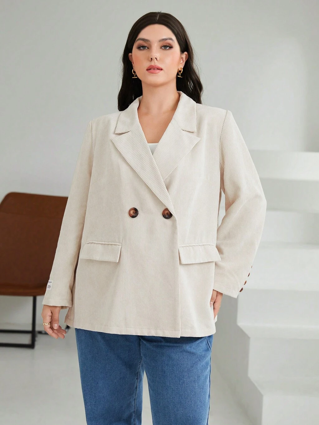 Plus Size Faux Pocket Woolen Jacket