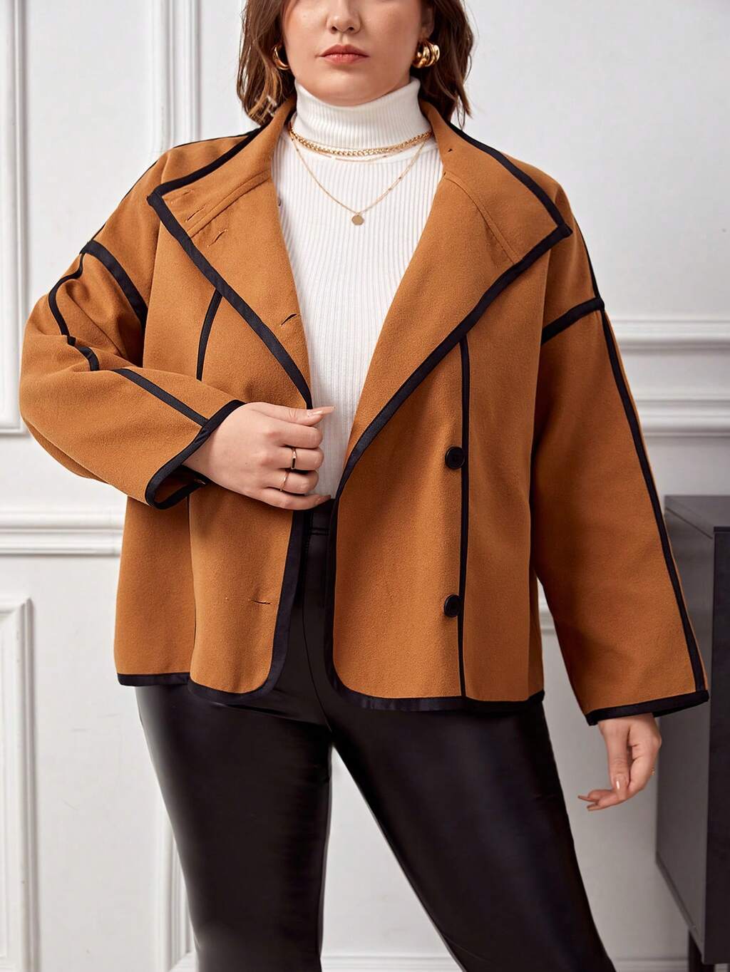 Plus Contrast Binding Waterfall Collar Belted Overcoat
