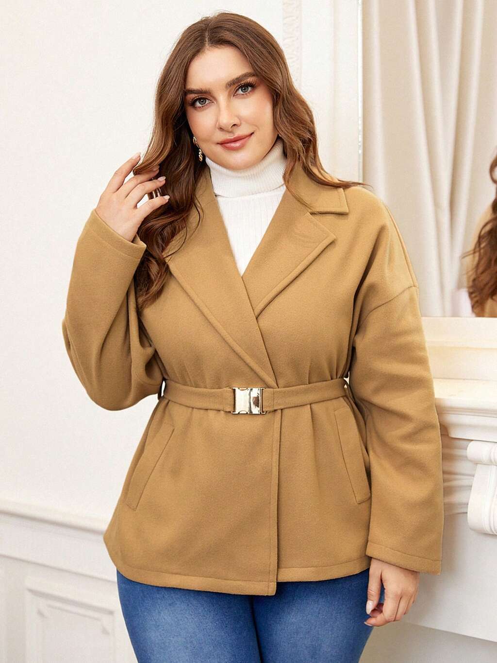 Plus Lapel Neck Drop Shoulder Belted Overcoat Fall Cloth For Women
