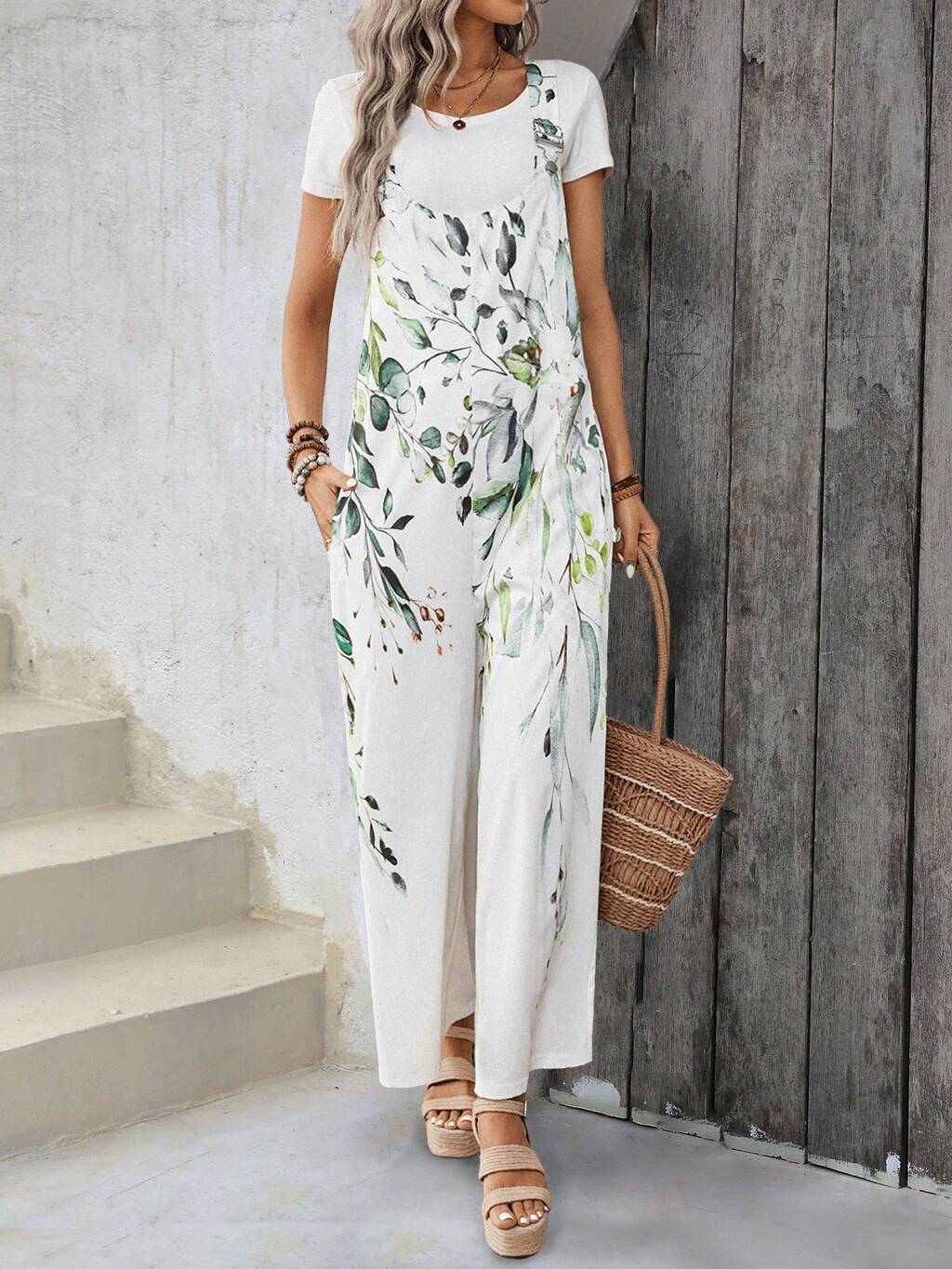 Green Floral Print Pocket Wide Leg Women Casual Jumpsuit For Summer