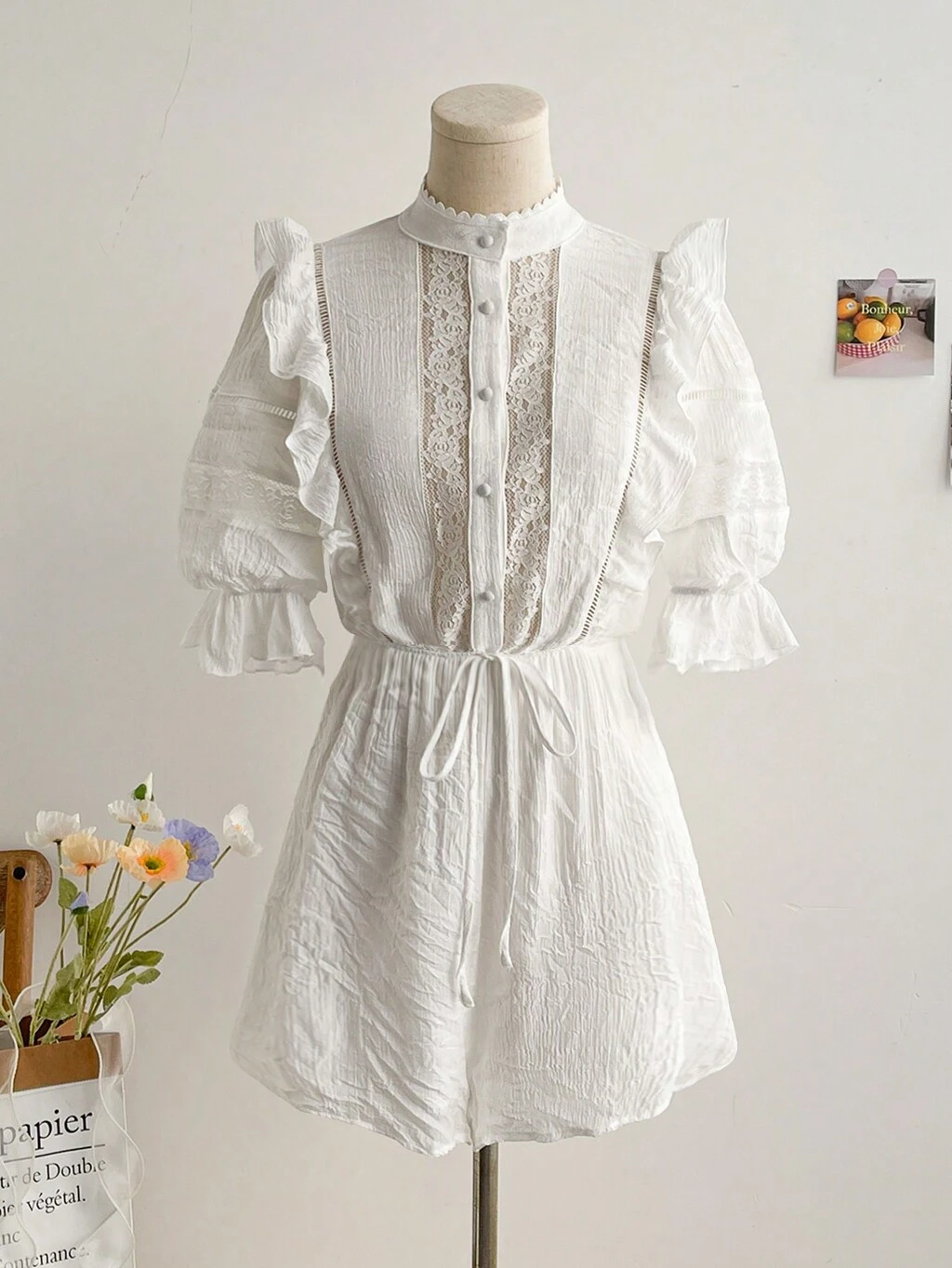 Women's Romantic Vacation Casual Lace Patchwork Romper With Ruffle Collar, Puffy Sleeves, Tie Waist, & Button Decor, Suitable For Wedding Season