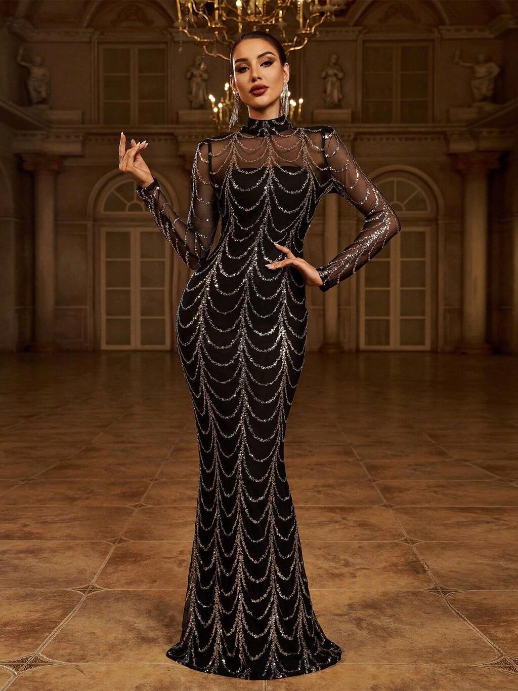 Missord Sheer Mesh Yoke Sequin Prom Dress Black Elegant Long Sleeve Formal Evening Wedding Guest Gown, For Graduation, Dinner Party Dress Spring Vacation