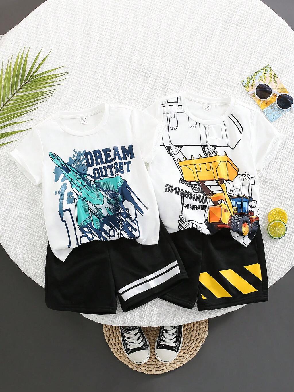 4pcs/Set Young Boy Casual, College Style, Comfortable, Fashionable, Simple, Practical, Versatile, And Soft T-Shirt With Cartoon Excavator Shaped Print And Black Shorts With Contrast Printed Hem & Rocket Shaped Print T-Shirt With Black Shorts With Contrast Printed Hem, Breathable And Comfortable, Suitable For Spring And Summer