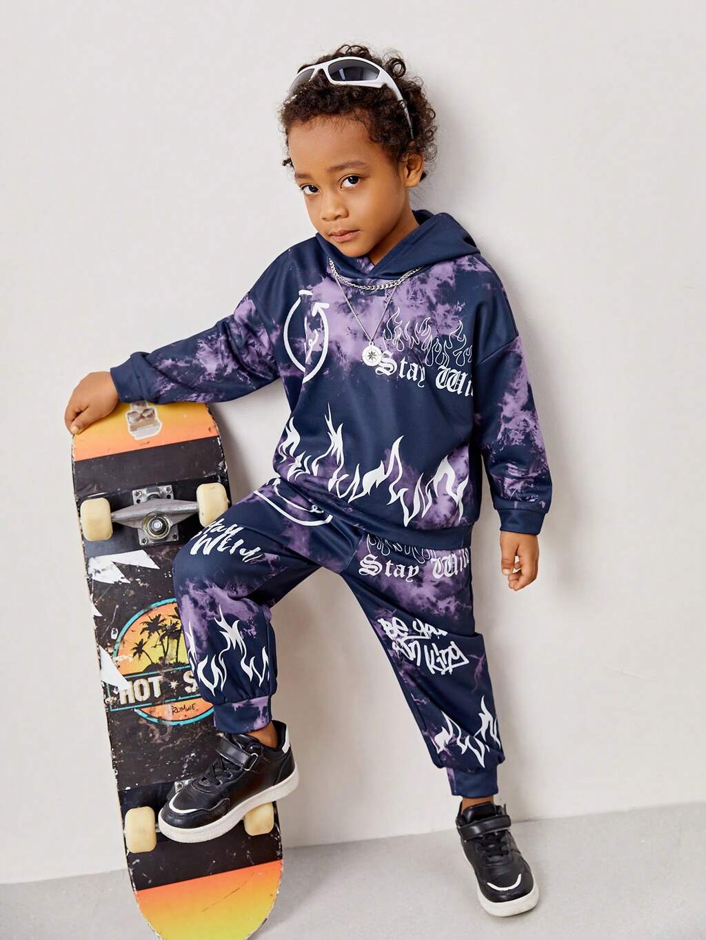 Young Boy Casual Loose Tie Dye Flame & Smiling Face Hoodie Sweatshirt With Knitted Pants Set, Fleece Thickened