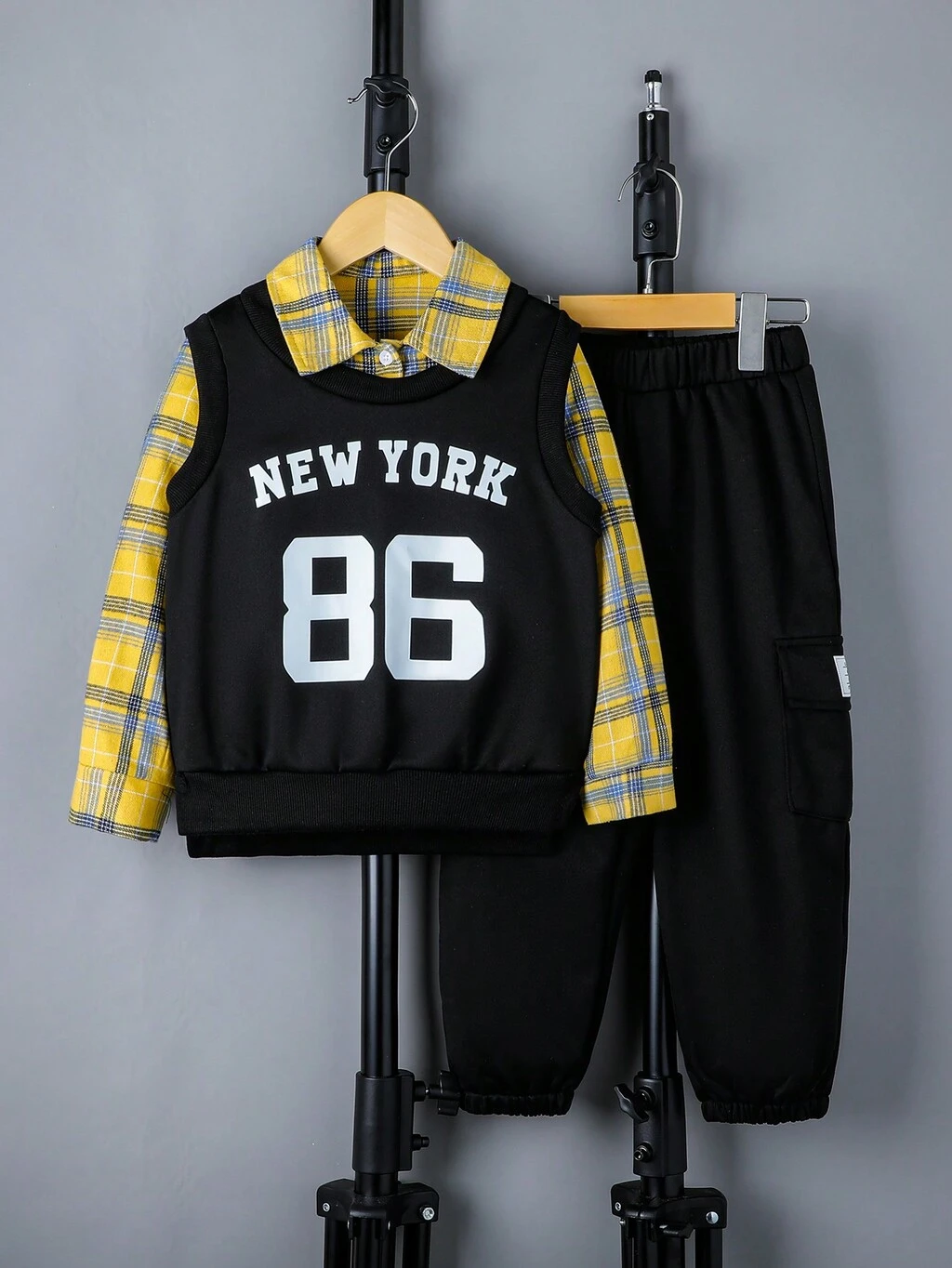 Young Boy Plaid & Letter Graphic 2 In 1 Sweatshirt & Sweatpants