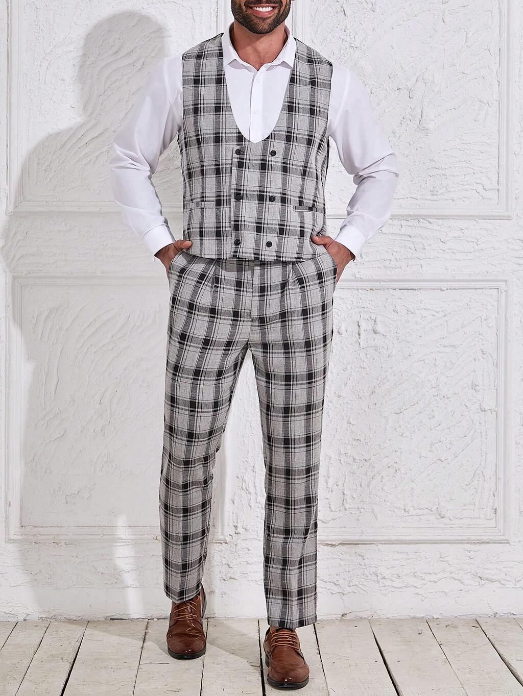 Men's Plus Size Grid Double Button Suit Vest And Straight Leg Suit Pants Set