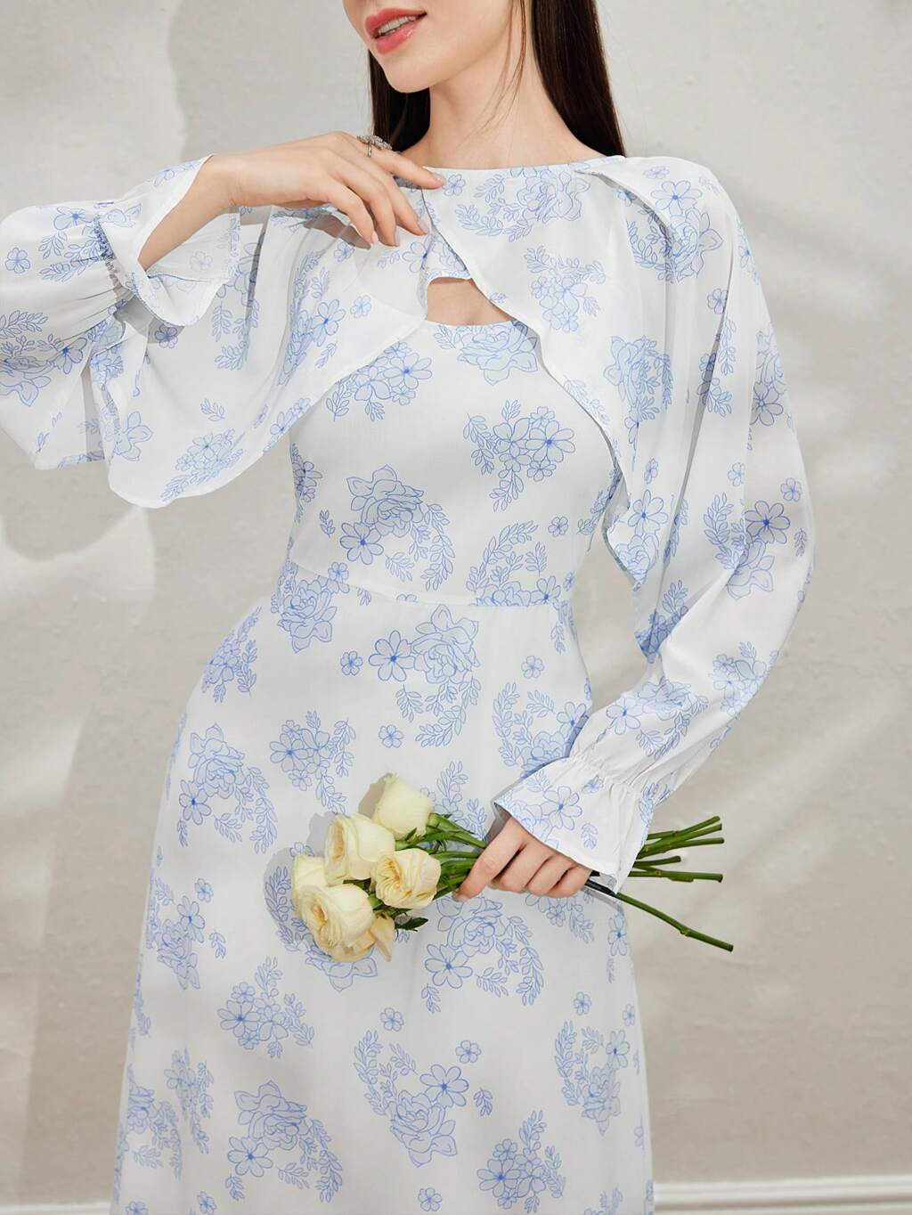 FLORAL PRINT FLARE SLEEVE RUFFLE TRIM DRESS