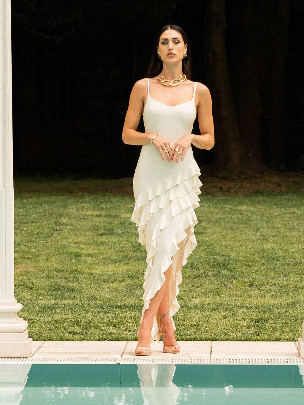 Women's Cream Knitted Strappy Love Neck Long Dress, Asymmetric Multi-Layered Ruffled Slit Dress