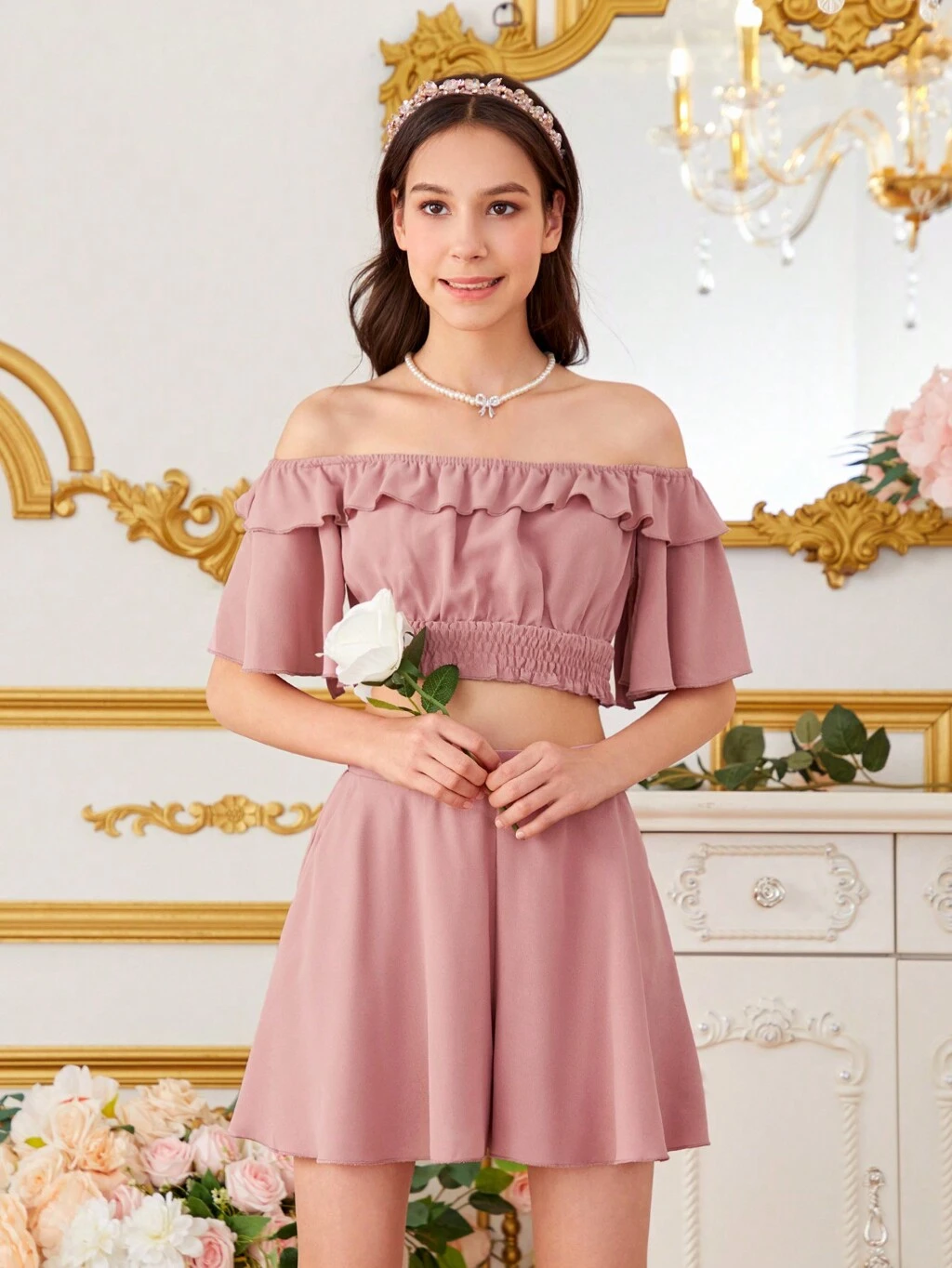 Teen Girls' Solid Off Shoulder Top With Ruffle Trim And Shorts Set