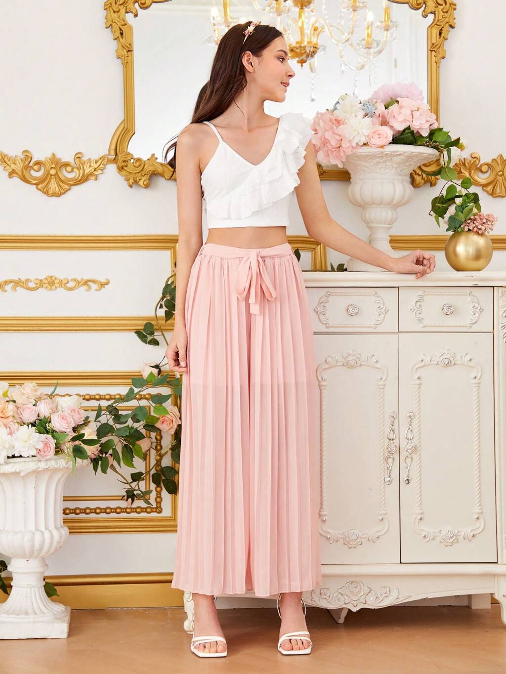 Asymmetrical Neck Ruffle Trim Crop Top & Pleated Belt Wide Leg Pants