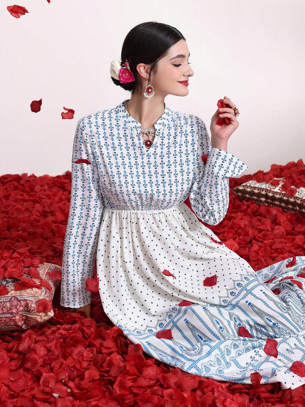 All-Over Printed Notched V-Neck Long Sleeve Dress