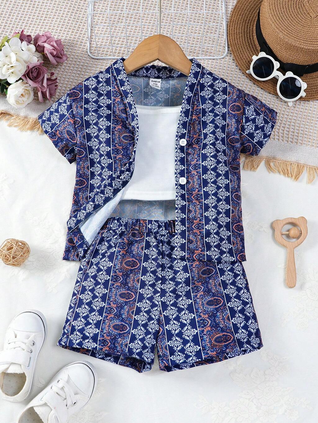 Baby Girls' Short Sleeve Shirt + Woven Shorts + White Camisole Top With Full Pattern 3pcs Outfit Set