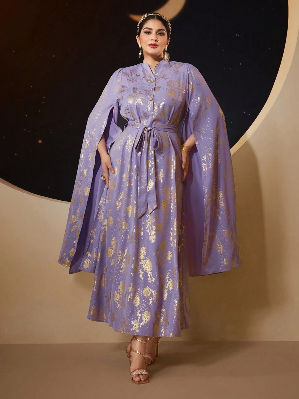 Plus Size Cape Sleeve Dress With Notched Neckline And Gold Foil Print, Elegant Luxury Evening Party Style Kaftan Jalabiya Dress