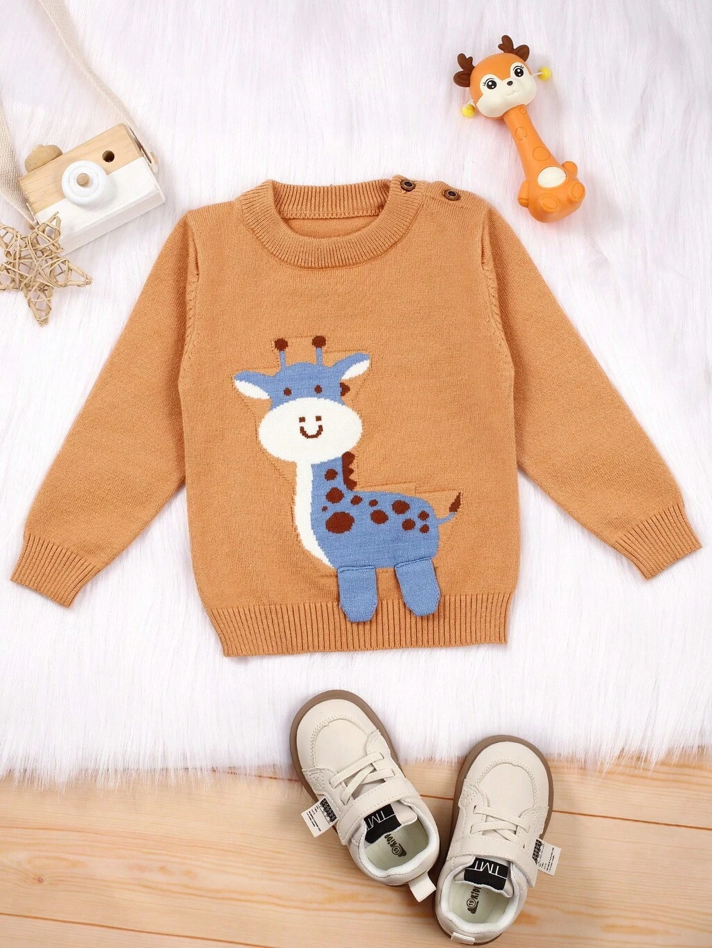 Baby Boy's Giraffe Patterned Round Neck Color Block Sweater