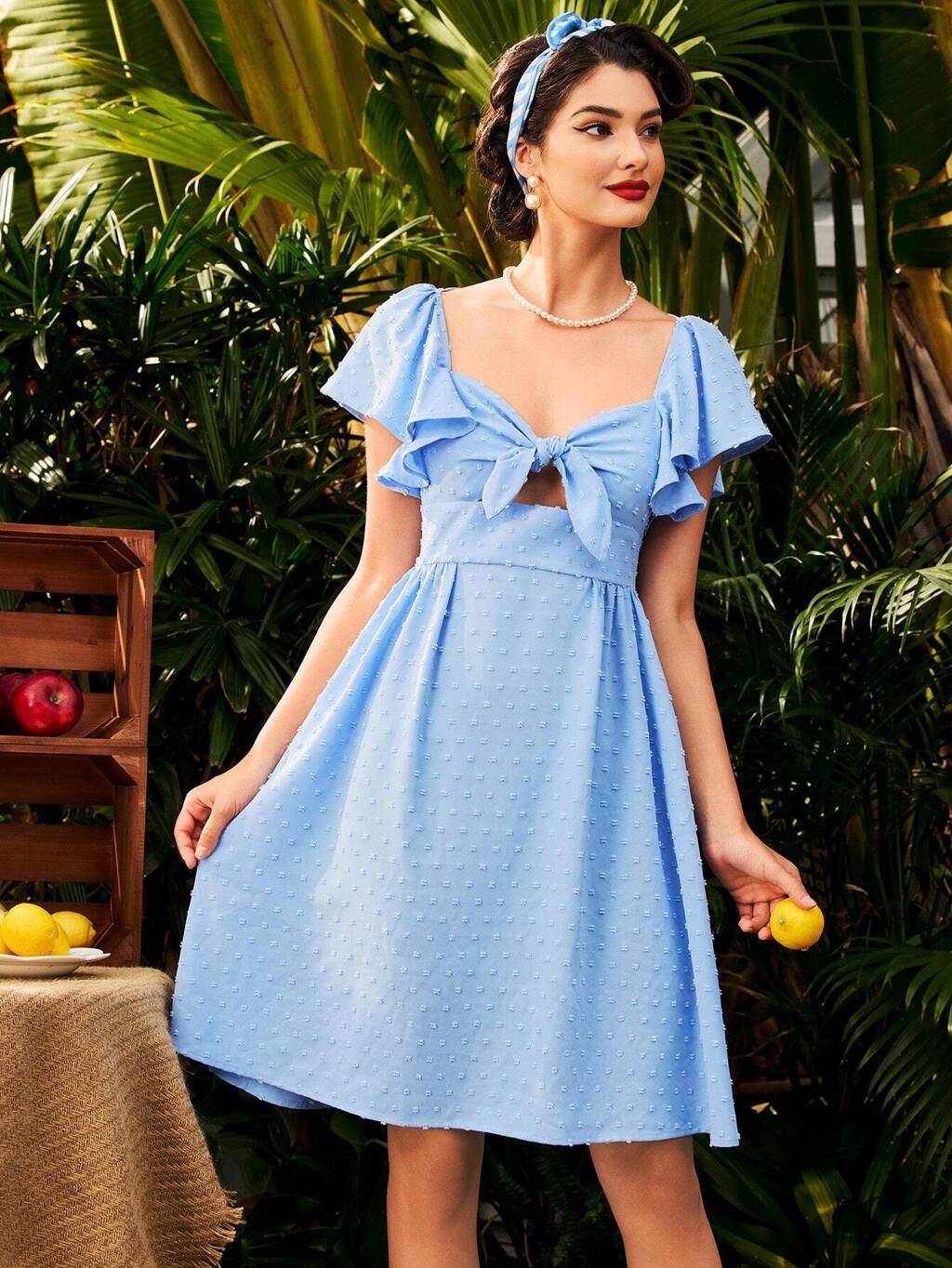 Vintage Elegant Holiday Women Dress With Floral Cutout, Ruffle Sleeves, Sweetheart Neckline And Front Tie Summer Concert Outfits Brunch Dress Vacation Blue Dress Bow Summer Clothes Festival Outfits Mother Day Outfit Sundress Short