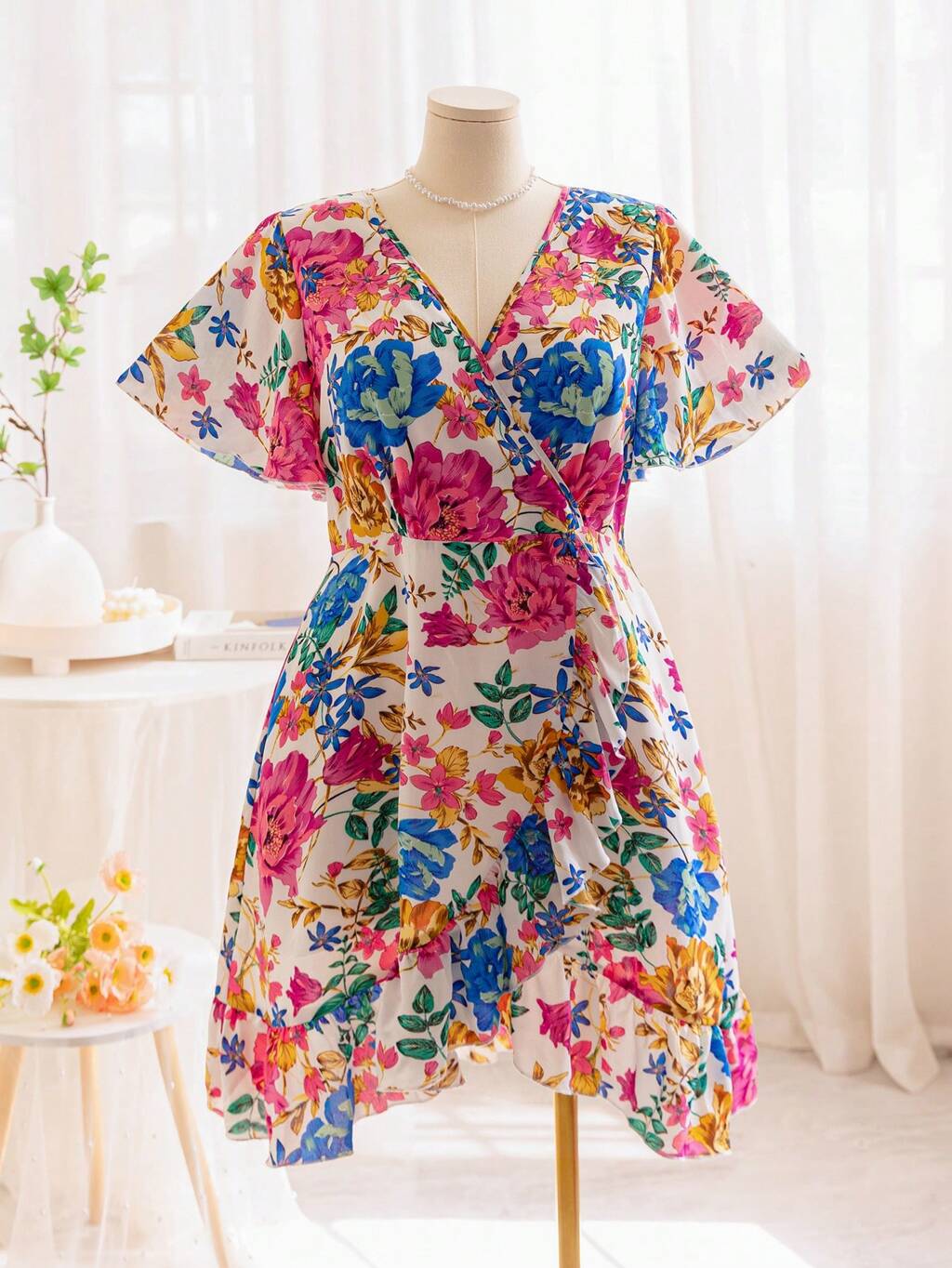Plus Size Women's White Floral Wrap Split Hem Ruffled Short Dress With V-Neck And Waist Tie, Casual & Vacation Style