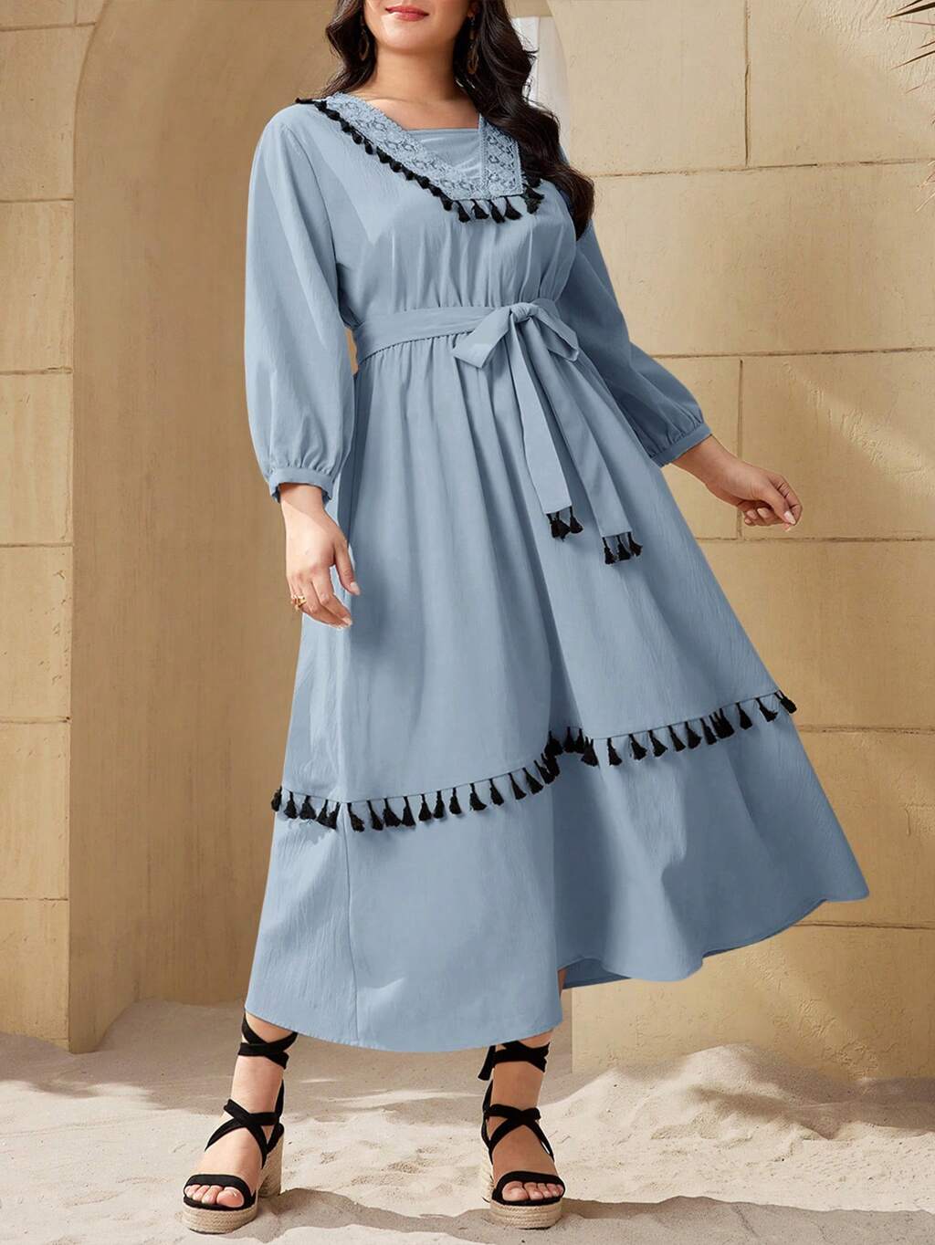 Plus Size Vacation Casual Lace Splice Tassel Decorated Lantern Sleeve Dress