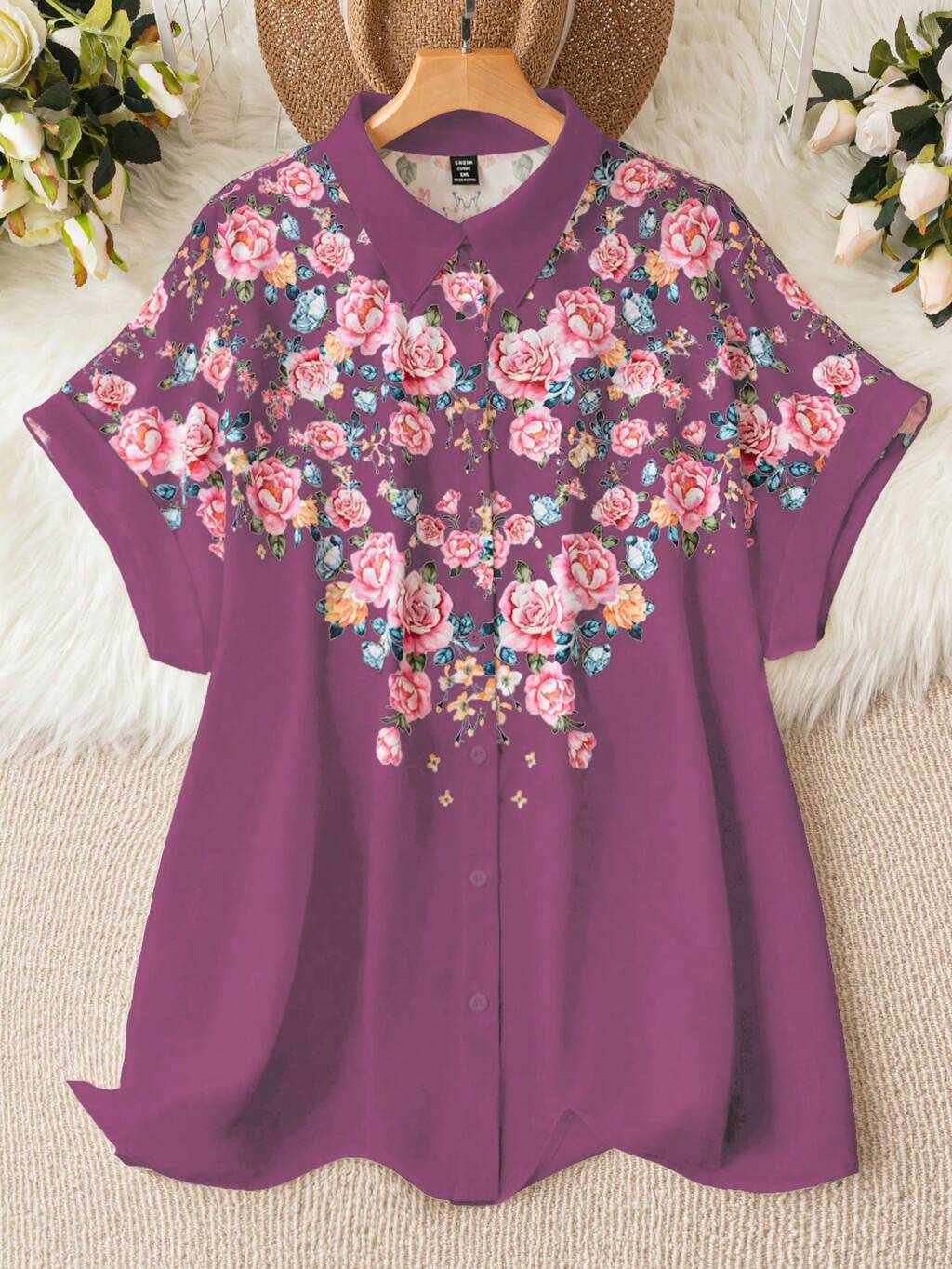 Plus Size Floral Print Button Front Batwing Sleeve Shirt