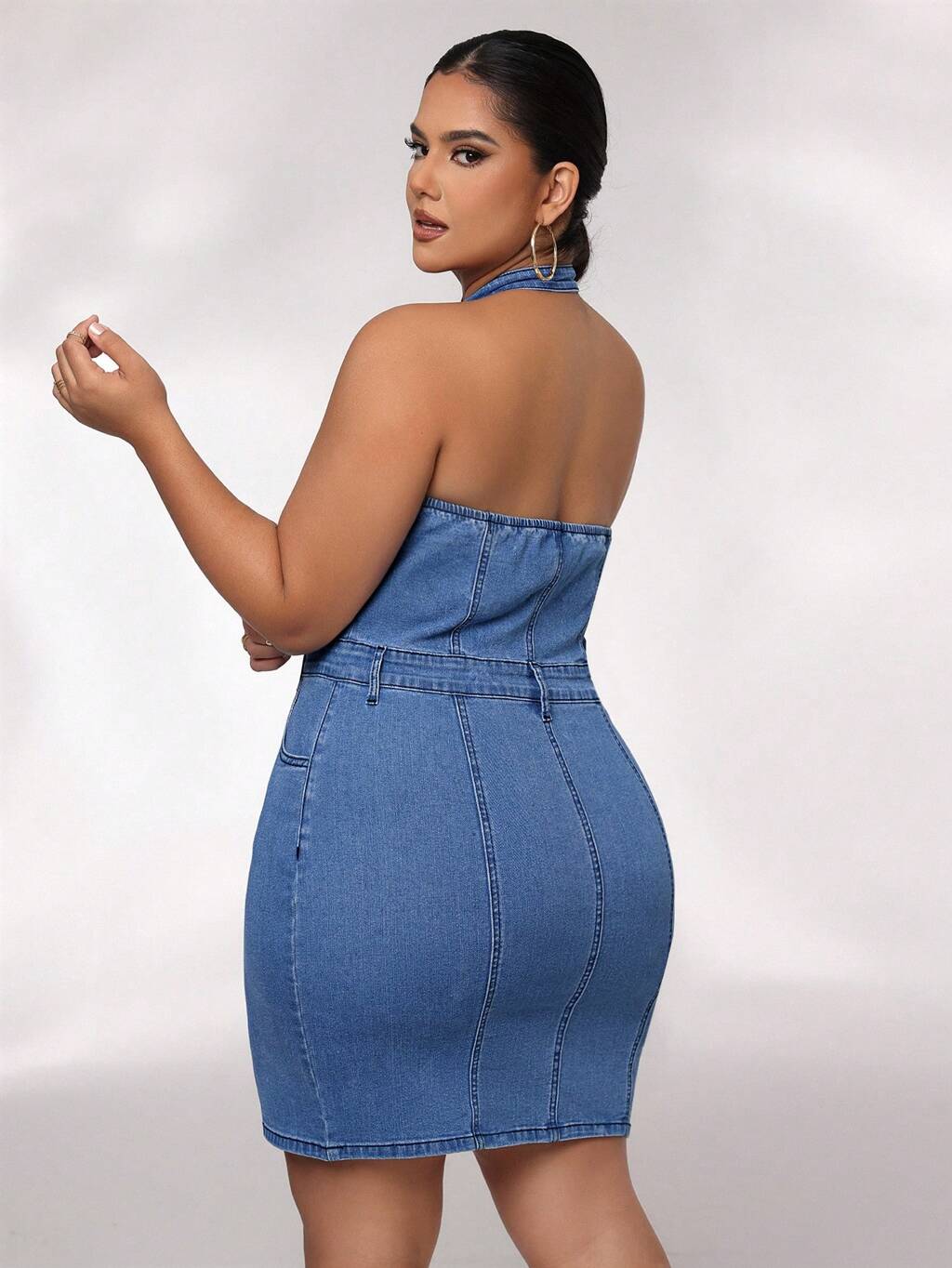 Plus Size Women's Halter Neck Bodycon Denim Dress