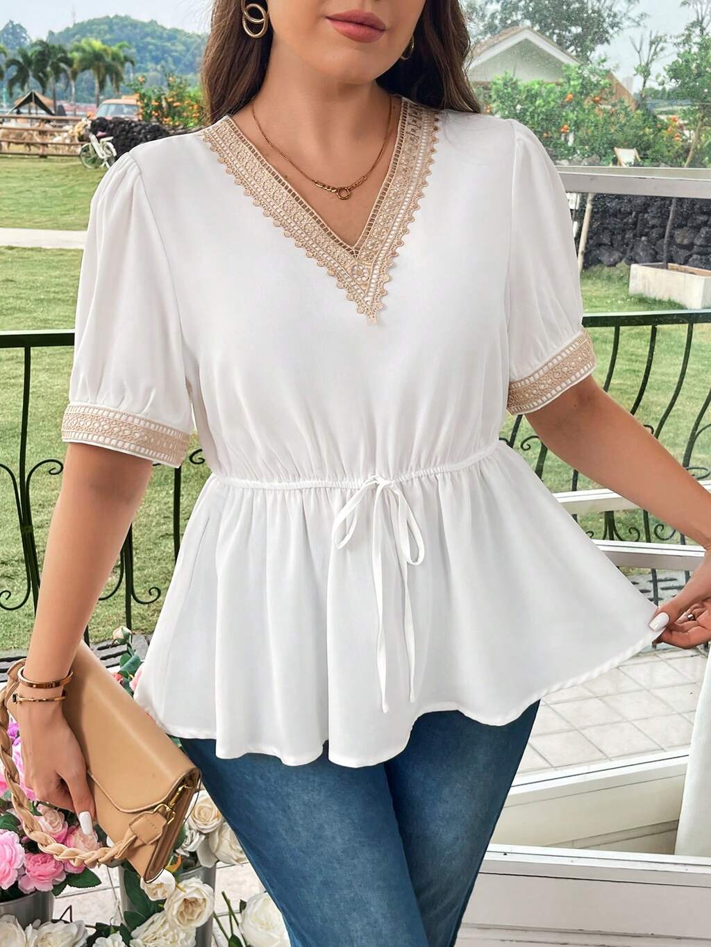 Plus Size Embroidered Applique Short Sleeve Blouse With Asymmetrical Ruffle Hem