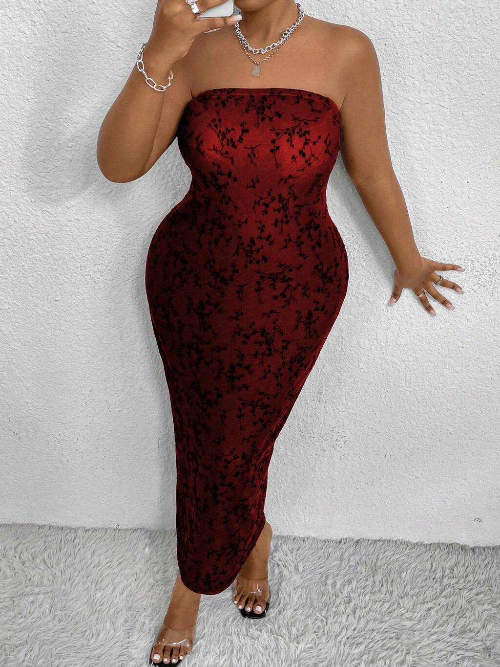 Plus Size Velvet Mesh Overlay Strapless Dress
