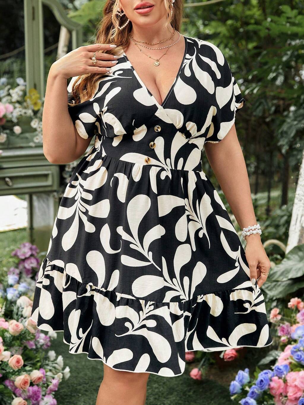Plus Size Floral Printed Knot Sleeve Hemline Dress