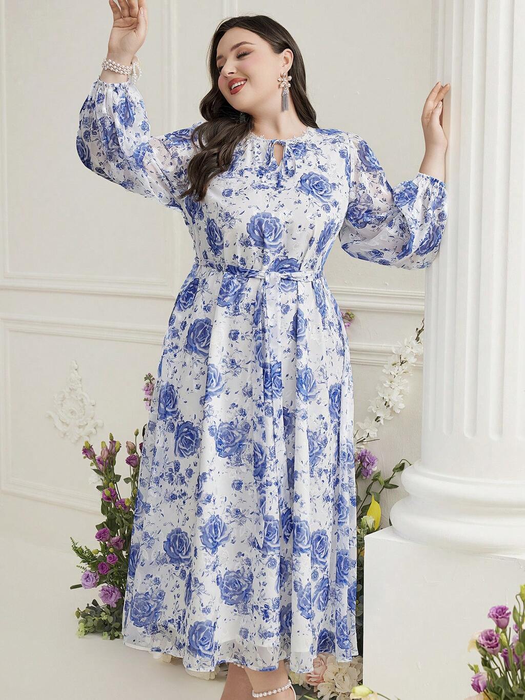 Plus Size Full Printed Front Tie Long Sleeve Dress Long Evening Dresses