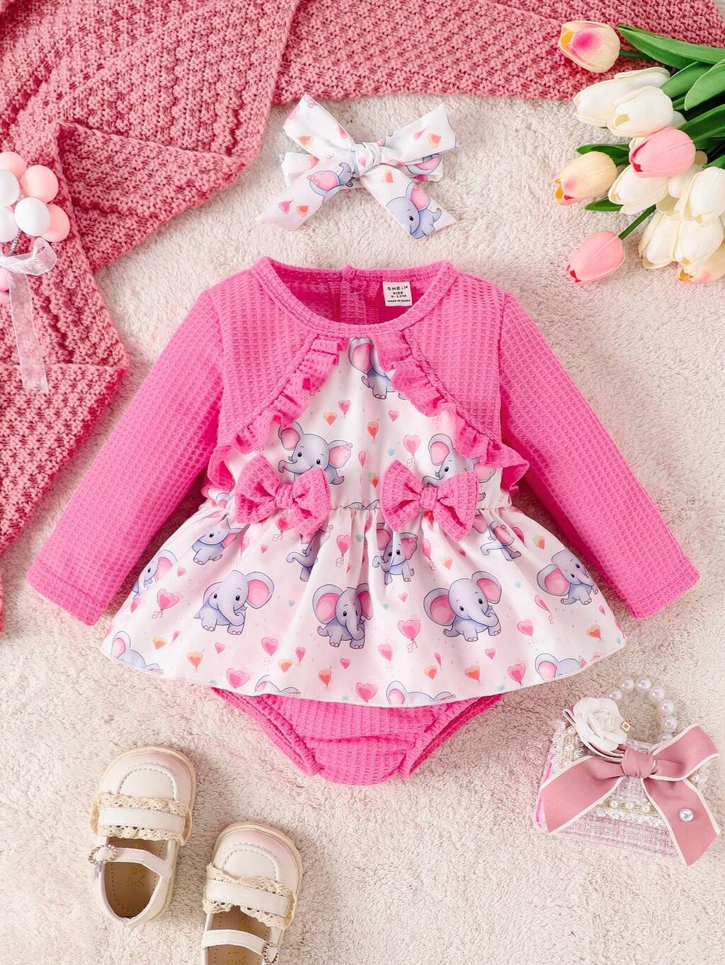 Baby Girl Heart & Elephant Print Ruffle Trim Bow Front Bodysuit Without Headband