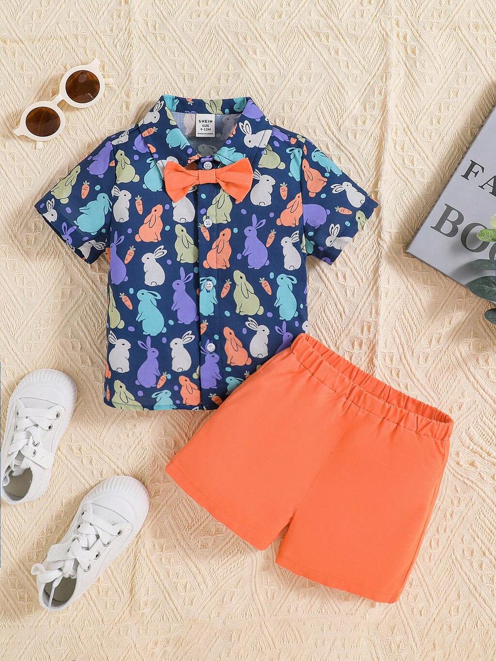 Baby Boys' Easter Bunny Printed Short Sleeve Shirt And Solid Color Casual Shorts Set