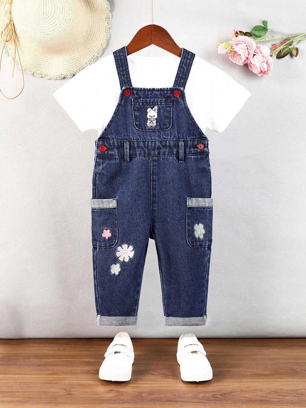 Baby Girl's Sandblasted Floral Print Denim Overalls