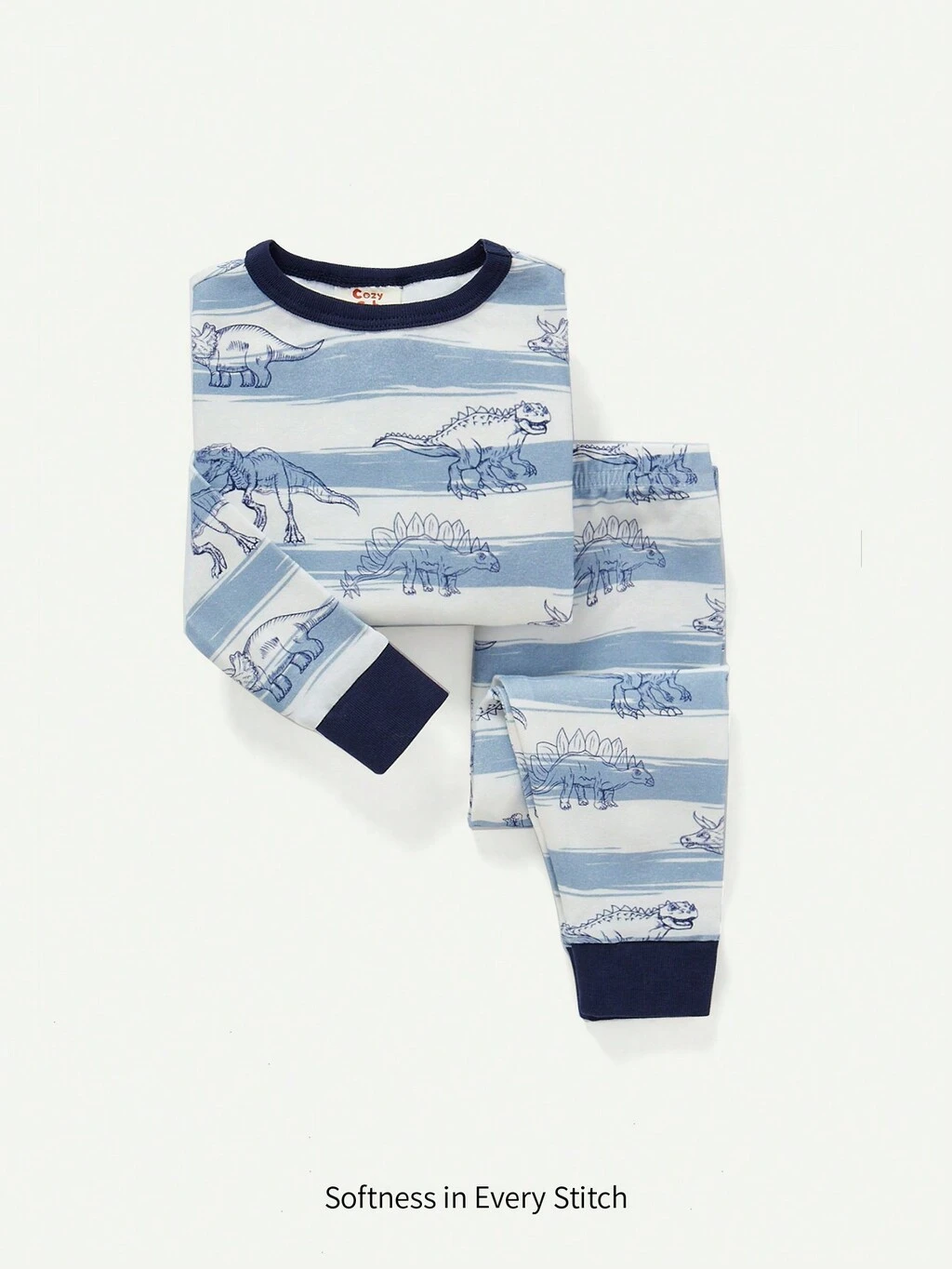 Baby Boy Snug Fit Pajamas, Striped Fun Little Dinosaur Print Tops Round Neck Long Sleeve And Footed Pants Set