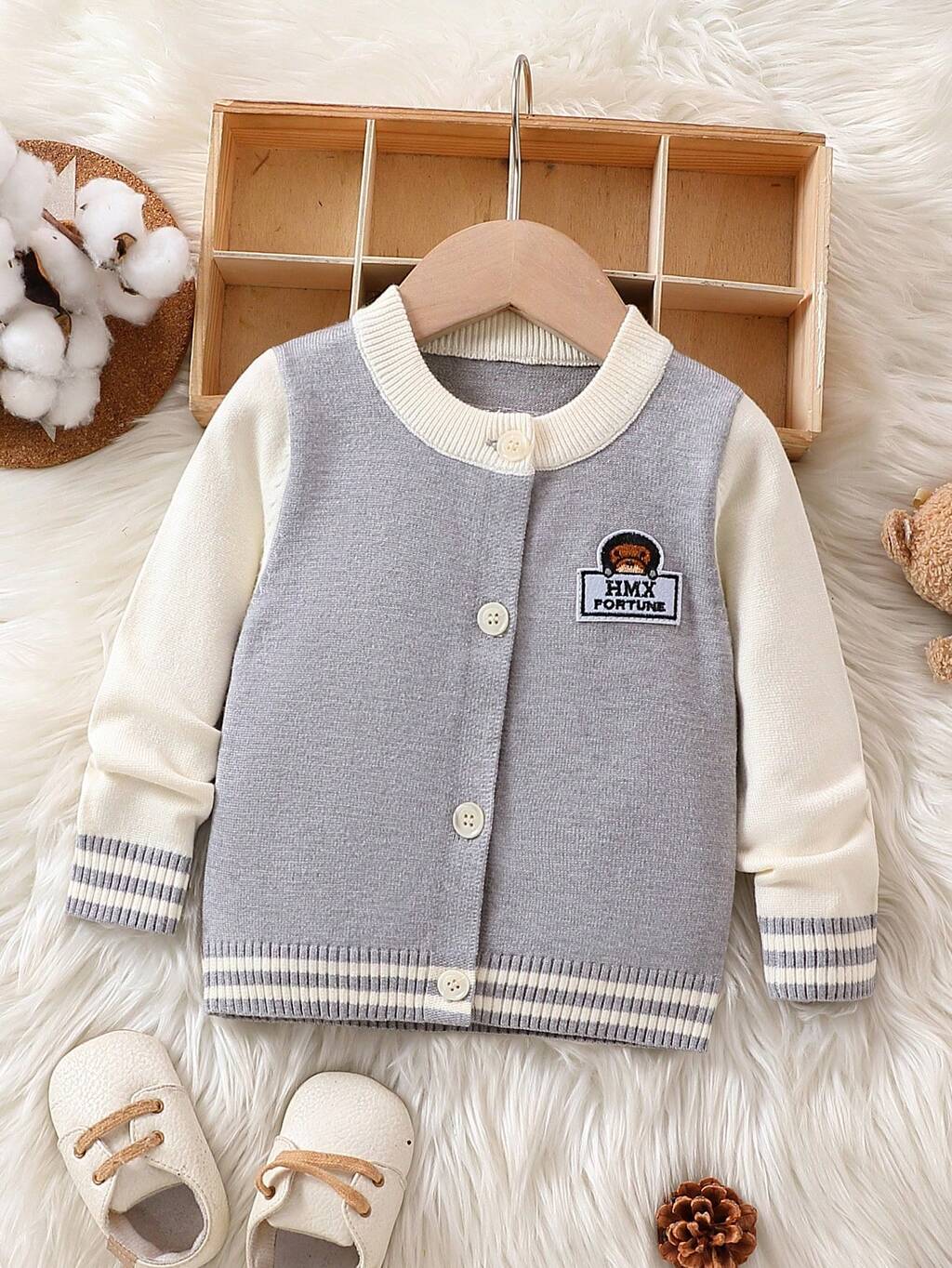 Baby Boys' Z-shaped Pattern Bear Patch Cardigan With Front Snap, Gray