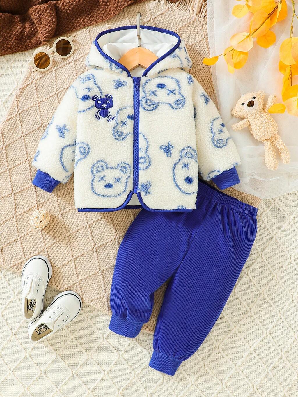 Baby Boys' Blue Pants And Teddy Bear Print Hooded Fleece Jacket Set