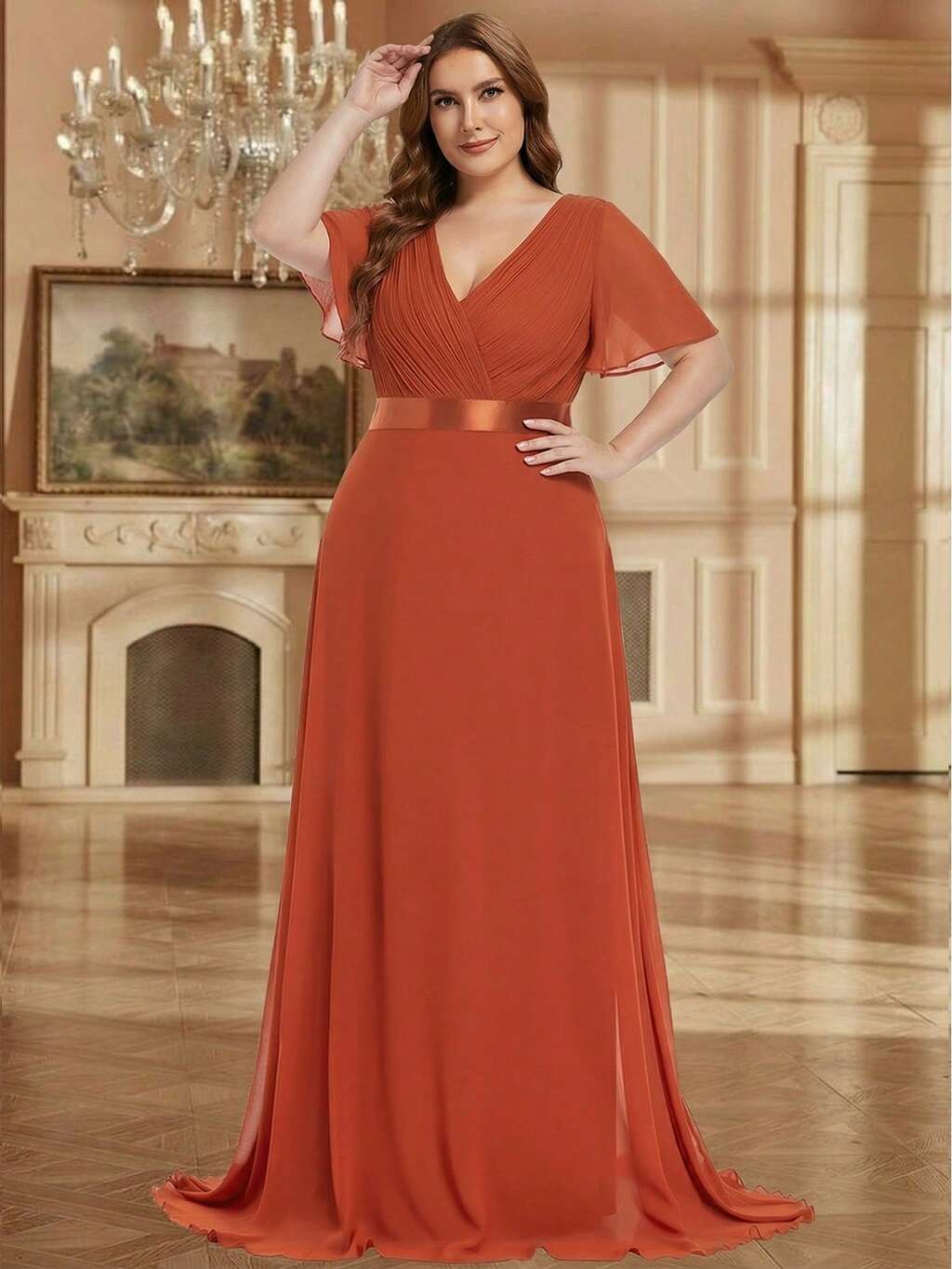 EVERPRETTY Plus Size Elegant V-Neck Ruched Bust Tangerine Bridesmaid Dress, Spring/Summer Wedding Guest Formal Dress Party