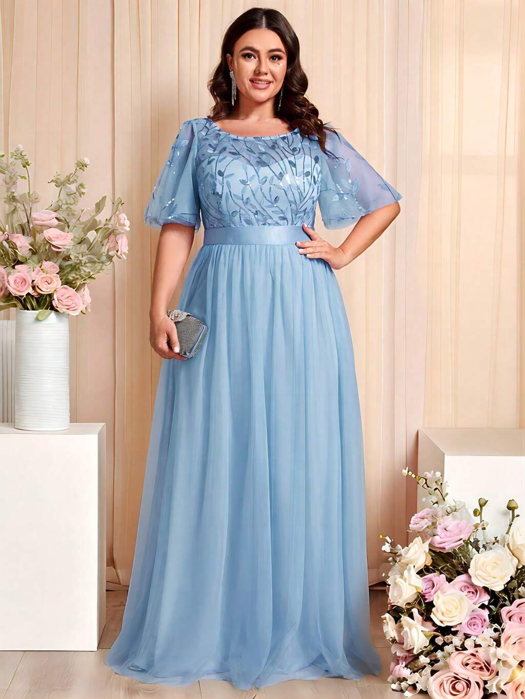 EVERPRETTY Plus Size Elegant Sequin & Mesh Patchwork Light Blue Bridesmaid Evening Dress, Spring/Summer Wedding Guest Gown, Party Dress, Mother Of The Bride Dress