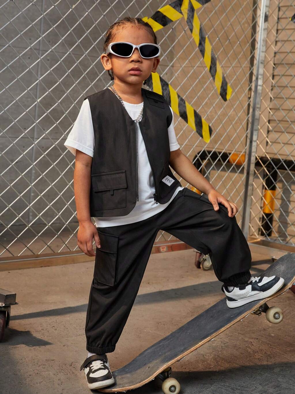 Young Boy's Cargo Style Vest Jacket, Round Neck Short Sleeve T-Shirt, Pants And Hat Set