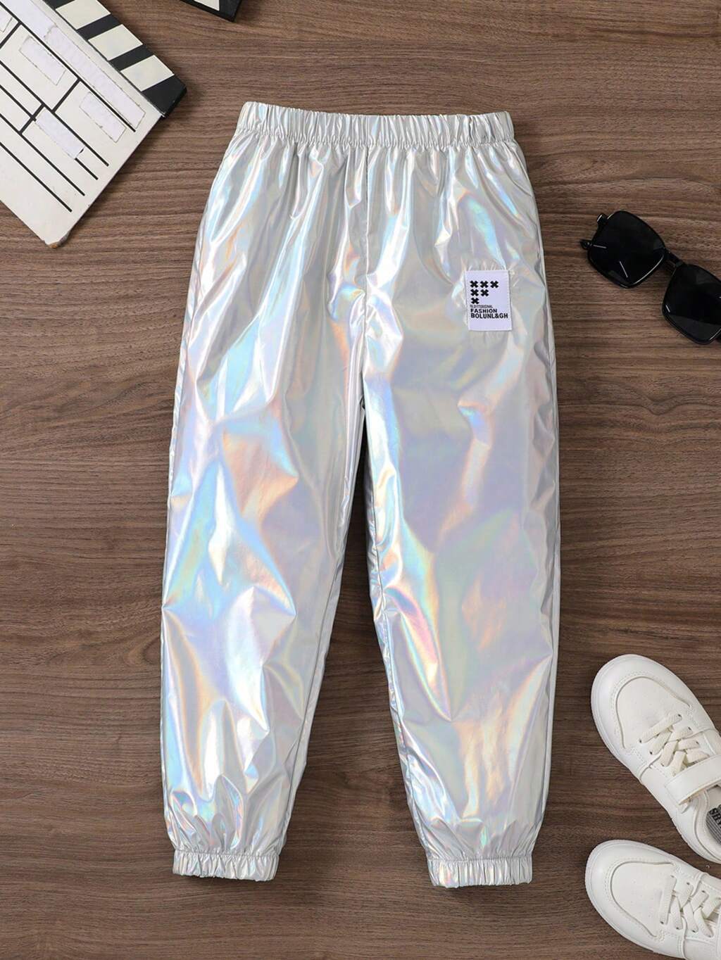 Young Boy Casual Metallic Reflective Fabric Alphabet Patchwork Jogger Pants With Cuffs, Suitable For Shows And Parties In Summer,Holiday,Summer,Travel