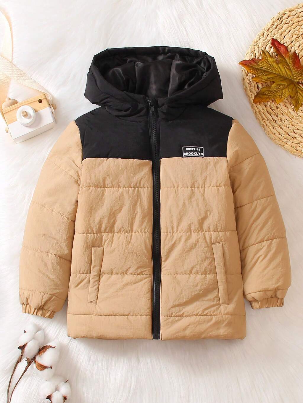 Young Boy Two Tone Letter Patched Detail Zipper Hooded Padded Coat