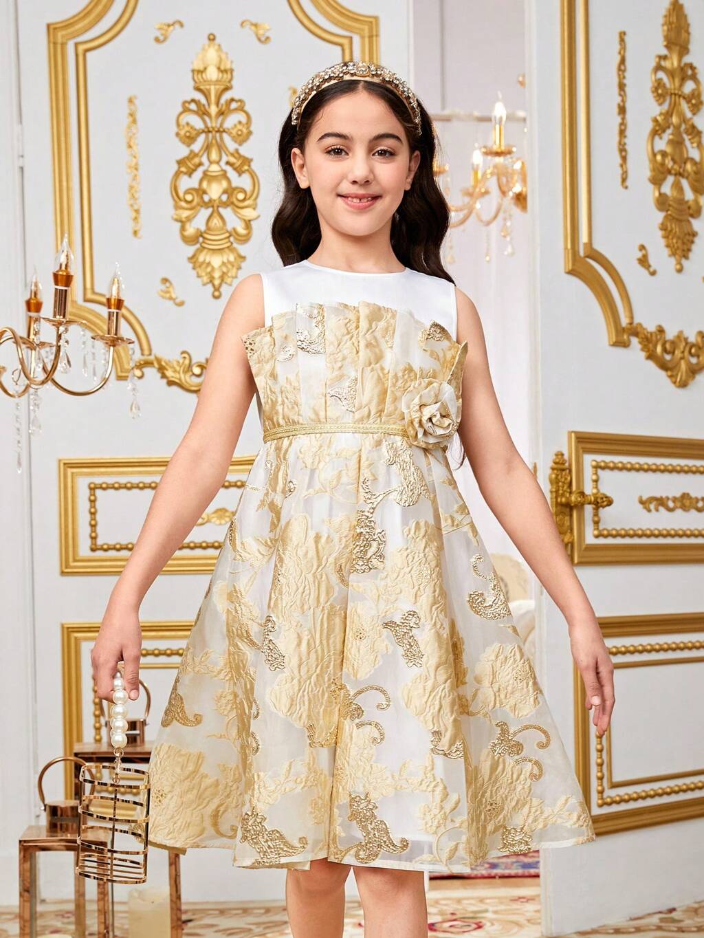 Teen Girl's Elegant Jacquard Gold Lace-Up Bell Sleeve Dress