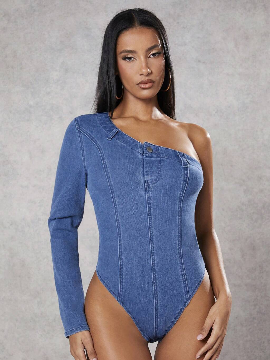 Sexy Slim Fit One Shoulder Denim Top For Women, Blue