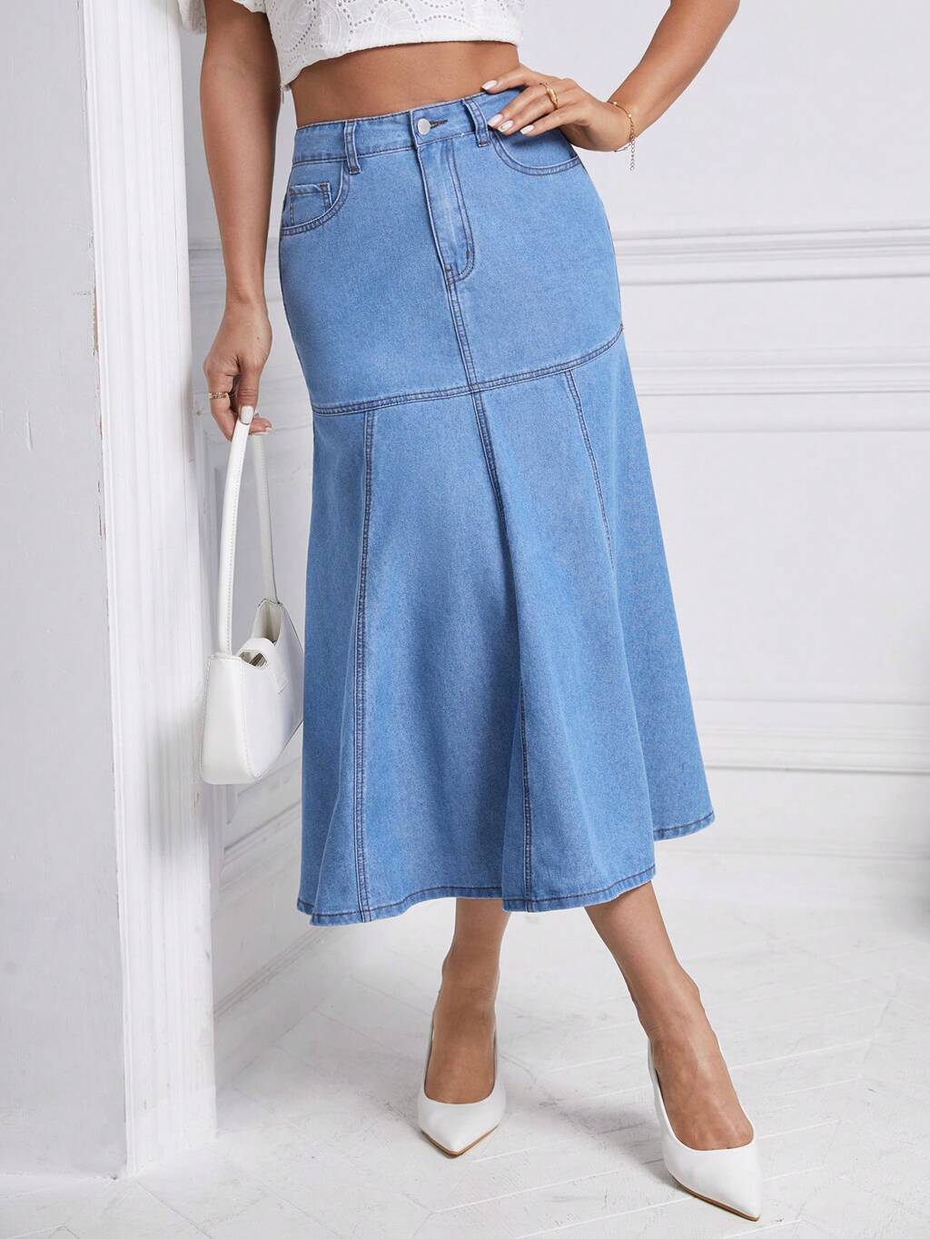 Women's Blue Asymmetrical Elastic High Waist Loose Comfortable Denim Skirt For Casual Or Semi-Formal Occasions